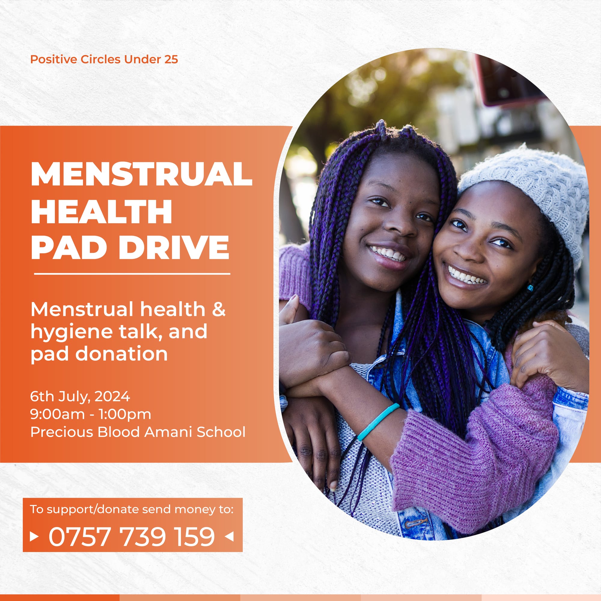 Positive Circles Under 25 will host a pad drive at Precious Blood Amani School on 6th July. We will also have a Menstrual Health and Hygiene talk besides donations. Your support in donations and/or appearance will make a difference.